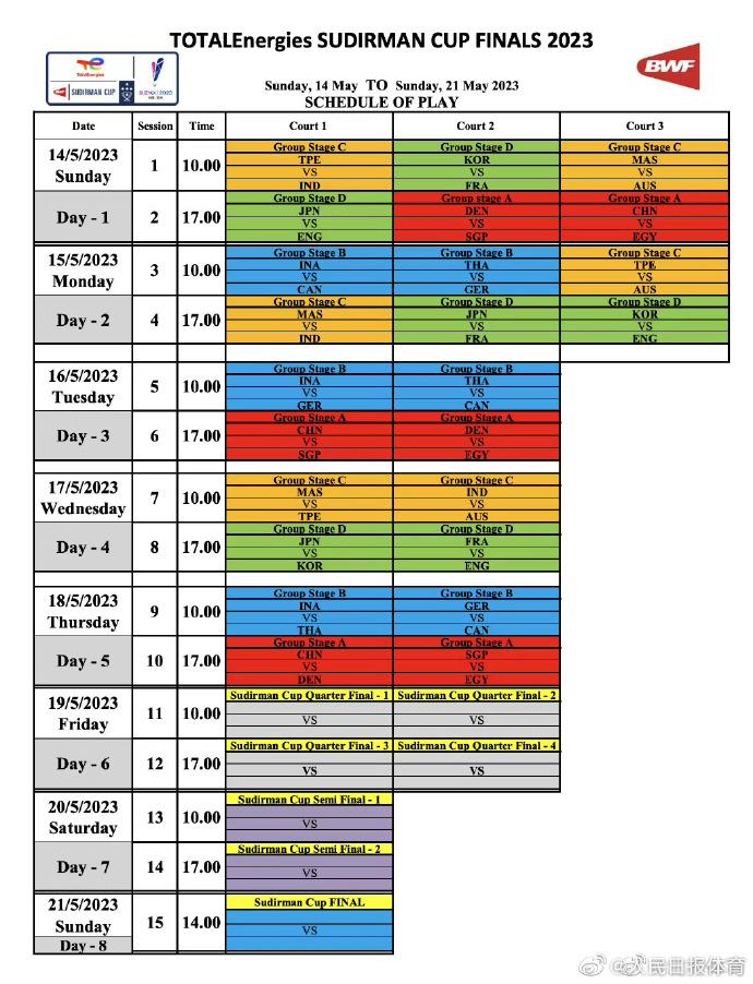 2023年苏迪曼杯竞赛日程。图片来源:中国羽毛球协会微信公众号