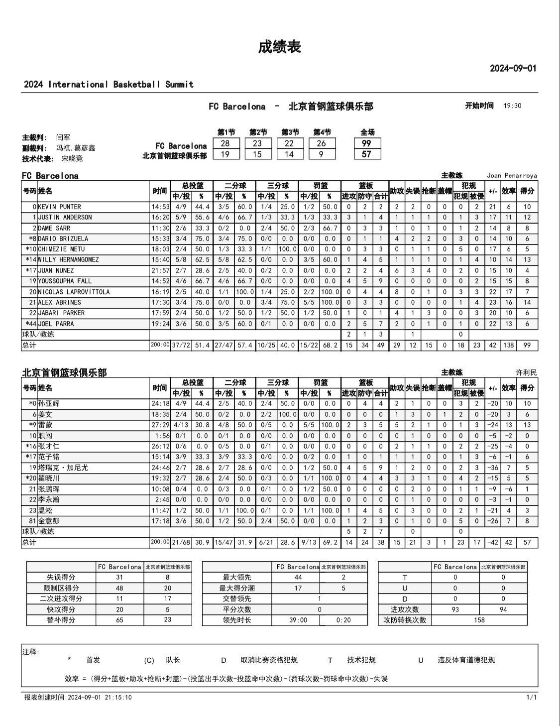 北京时间9月1日,巴塞罗那男篮中国行。在国际篮球巅峰赛中,北京首钢57-99巴萨男篮,雷蒙13分,埃尔南戈麦斯13分,贾斯汀-安德森12分。