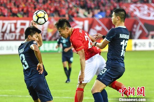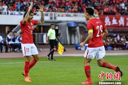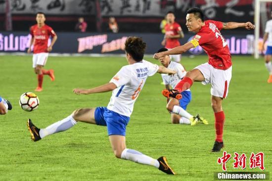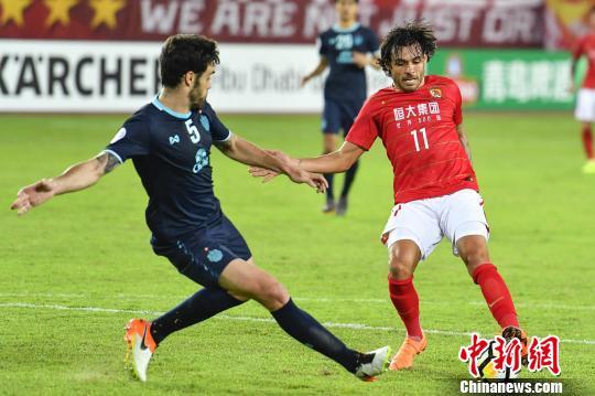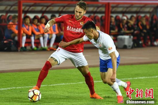 广州恒大淘宝球员古德利与对手拼抢球权。 (中新社记者 陈骥旻 摄)