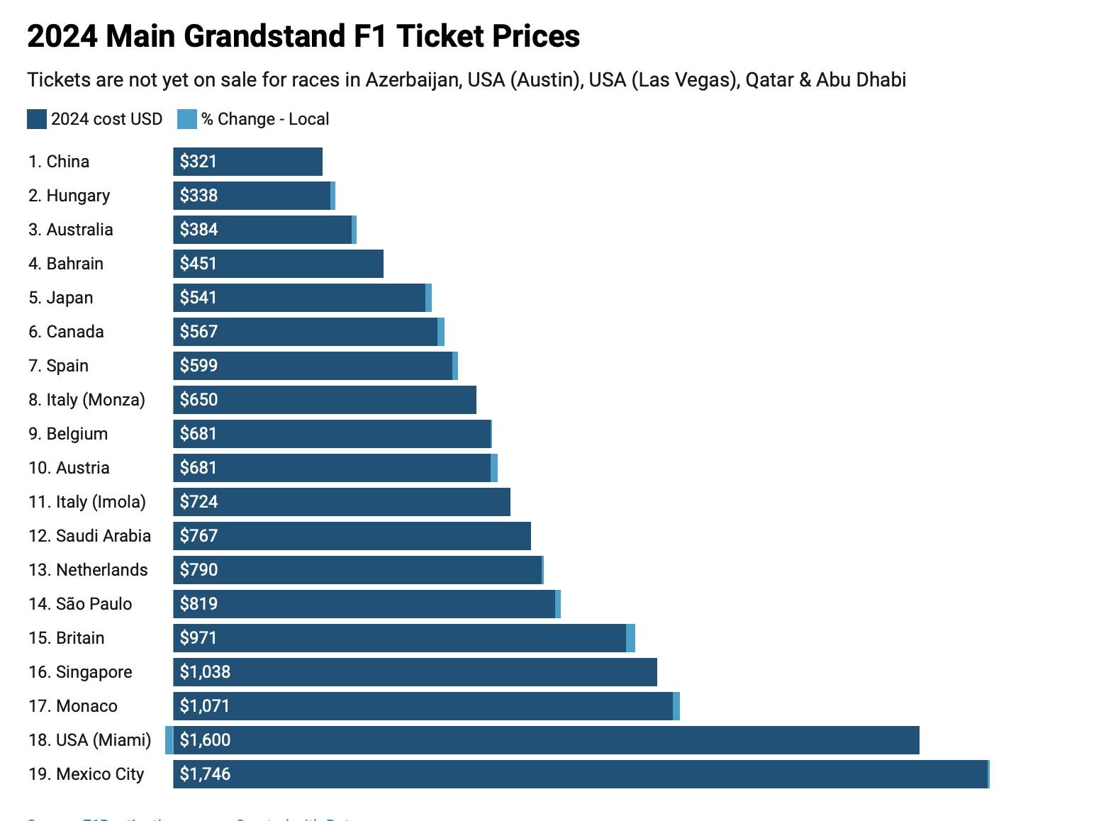 据国外媒体RANKED统计,2024赛季F1大奖赛各站的平均套票价格,其中中国站最便宜,仅199美元,最贵的是783美元的墨西哥站。