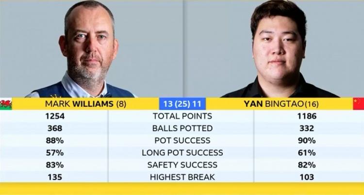 第三阶段开始后,颜丙涛率先爆发连胜2局,大比分10:8领先。不过此后,马克-威廉姆斯打出单杆135分,并连扳2局,大比分追成10:10。