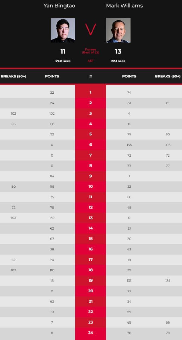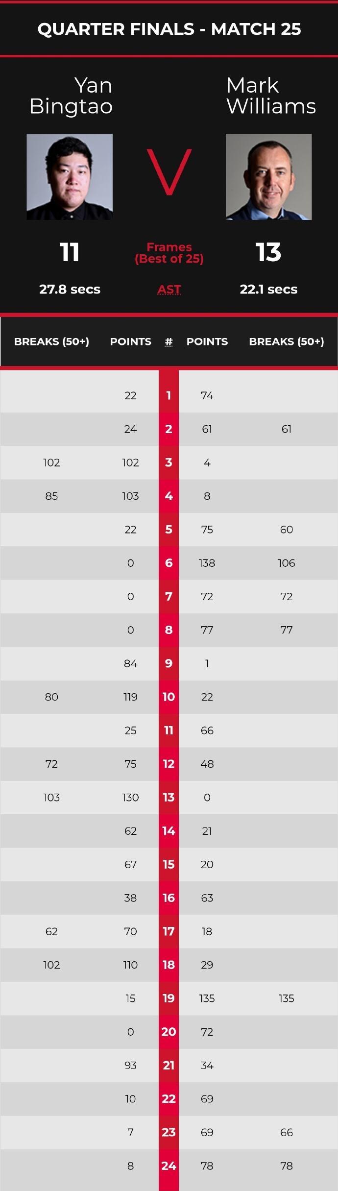 第21局,颜丙涛以93:34再胜一局,大比分11:10再次领先。此后,马克-威廉姆斯开始掌握比赛节奏连扳3局,大比分13:11逆转胜出,职业生涯第7次打进世锦赛半决赛。
