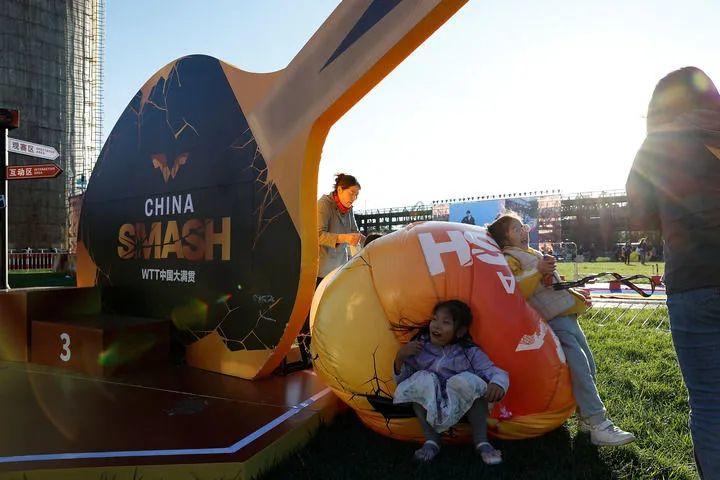 10月1日,孩子们在大满贯公园玩耍。当日,2024年世界乒乓球职业大联盟(WTT)中国大满贯比赛继续在北京进行。新华社记者 王丽莉 摄