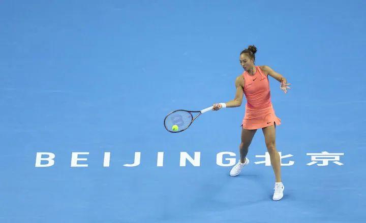 10月2日,郑钦文在比赛中回球。当日,在北京进行的2024中国网球公开赛女子单打第四轮比赛中,中国选手郑钦文2比1战胜美国选手阿尼西莫娃,晋级八强。新华社发(杜昕怡摄)
