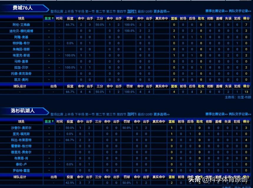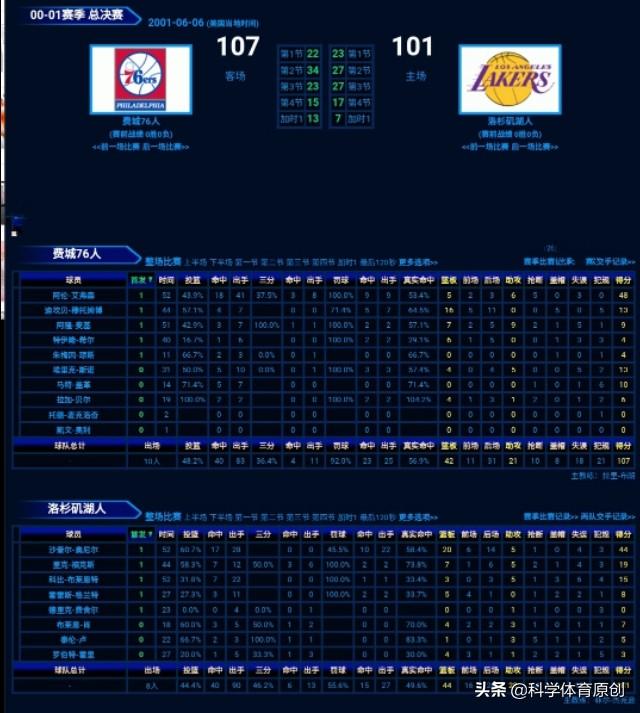 艾弗森48分5篮板6助攻,穆大叔13分16篮板5盖帽,奥尼尔44分28篮板6助攻。科比15分3篮板5助攻。