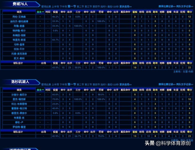 第一节艾弗森独得12分3篮板1助攻,湖人奥尼尔7分5篮板,福克斯10分4篮板3助攻,科比2分1篮板3助攻。