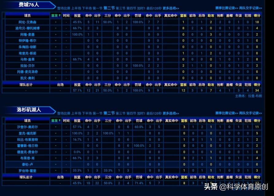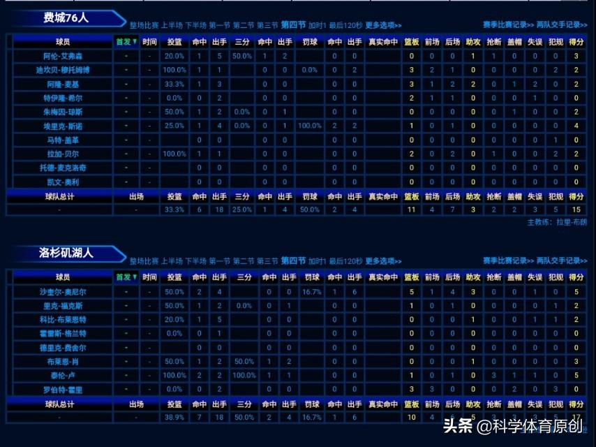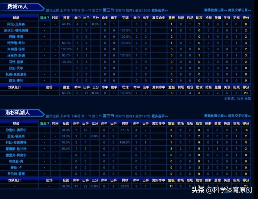 这节艾弗森3分1助攻,奥尼尔5分3板。卢5分3板3抢断。科比2分1篮板。