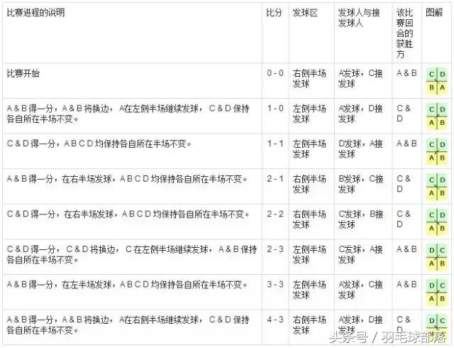 比赛进程的说明比分发球区发球&接发获胜方图解比赛开始0 - 0右侧半场发球A发球,C接发球A & B A & B 得一分,A & B 将换边, A在左侧半场继续发球, C & D 保持各自所在半场不变。1 - 0左侧半场发球A发球,D接发球C & D C & D 得一分,A B C D 均保持各自所在半场不变。1 - 1左侧半场发球D发球,A接发球A & B A & B 得一分,在右半场发球,A B C D 均保持各自所在半场不变。2 - 1右侧半场发球B发球,C接发球C & D C & D 得一分,在右半场发球,A B C D 均保持各自所在半场不变。2 - 2右侧半场发球C发球,B接发球C & D C & D 得一分, C & D 将换边, C 在左侧半场继续发球, A & B 保持各自所在半场不变。2 - 3左侧半场发球C发球,A接发球A & B A & B 得一分,在左半场发球,A B C D 均保持各自所在半场不变。3 - 3左侧半场发球A发球,C接发球A & B A & B 得一分,A & B 将换边, A在右侧半场继续发球, C & D 保持各自所在半场不变。4 - 3右侧半场发球A发球,D接发球C & D羽毛球比赛规则 三打三