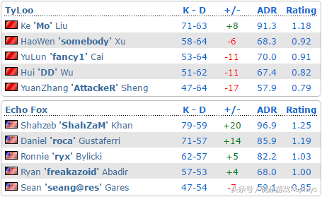 由于小组前二就可以进入到下一阶段的IEM,击败两个对手就成为了所有队伍的目标。首先来到的是Tyloo所在的A组,名副其实的死亡之组。世界排名第五的C9刚刚拿下了EPL的冠军,从正面击溃了SK的他们应该会毫无压力两连胜晋级。长期待在北美的Echo Fox除了E联赛被VP教育了一个16-1后再没参加过别的线下比赛,即便队中有两名前C9队员,实力早已不可同日而语。剩下的一个名额将在Tyloo和F3中诞生。近三个月,Tyloo的短板地图train和nuke胜率只有低的可怕的55.6%和0%,如果不让这两张图进入地图池,Tyloo将大有胜算。虽然MO的狙击枪和欧美比还存在一定差距,但Tyloo真正可怕的是全队都高于1rating值。这意味着即便Tyloo陷入困境,队中每个人都可以站出来挽回颓势,使队伍不会一蹦到底。