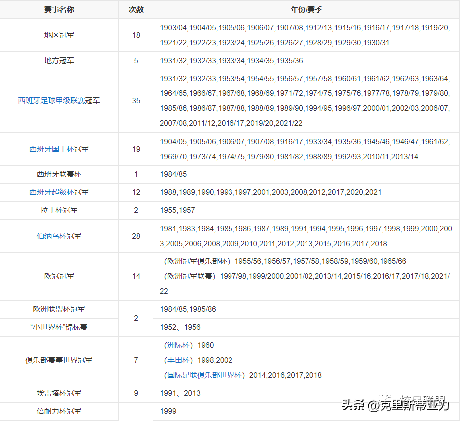 皇家马德里夺得过14次欧冠冠军(夺冠次数欧洲足坛第一)、35次西班牙足球甲级联赛冠军(西甲第一)、19次西班牙国王杯冠军、12次西班牙超级杯冠军、4次欧洲超级杯冠军和7次俱乐部赛事世界冠军(其中国际足联俱乐部世界杯冠军4次,夺冠次数第一)