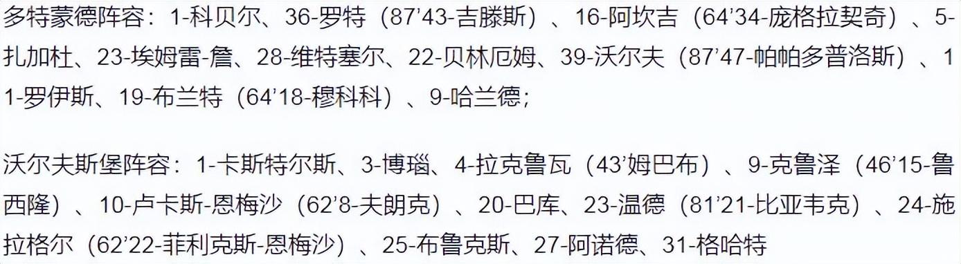 最终,全场比赛结束,多特蒙德6-1大胜沃尔夫斯堡。