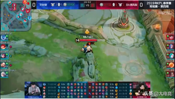 8分爆发团战,BA盘古拿下三杀,随后在上路抓死敌方一人,BA占据一定优势,但RW侠依旧不怂,12分钟主动出击,击杀敌方四人。
