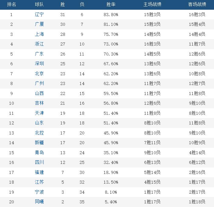 目前,前六的排名已经确定,按照胜负关系和净胜分,山西也已经确定排在第九,吉林确定排在第十。北京首钢与广州的排名、以及天津与山东的排名,将在最后一轮比赛结束后确定。