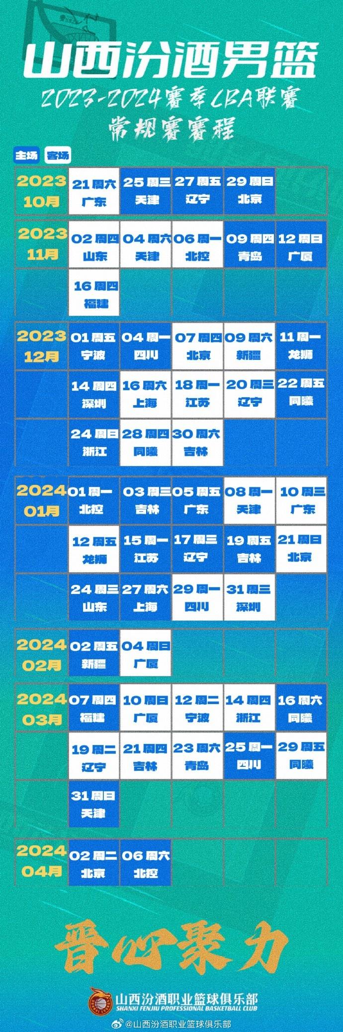 直播吧9月27日讯 今天,山西男篮官方晒出球队2023-24赛季的赛程表。其中: