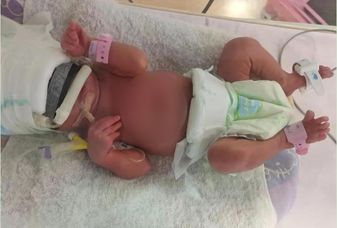 2月13日,宝宝情况加重,喂奶时奶水从嘴鼻流出,脸部和嘴唇发紫,被紧急送回省妇幼保健院的ICU病房。