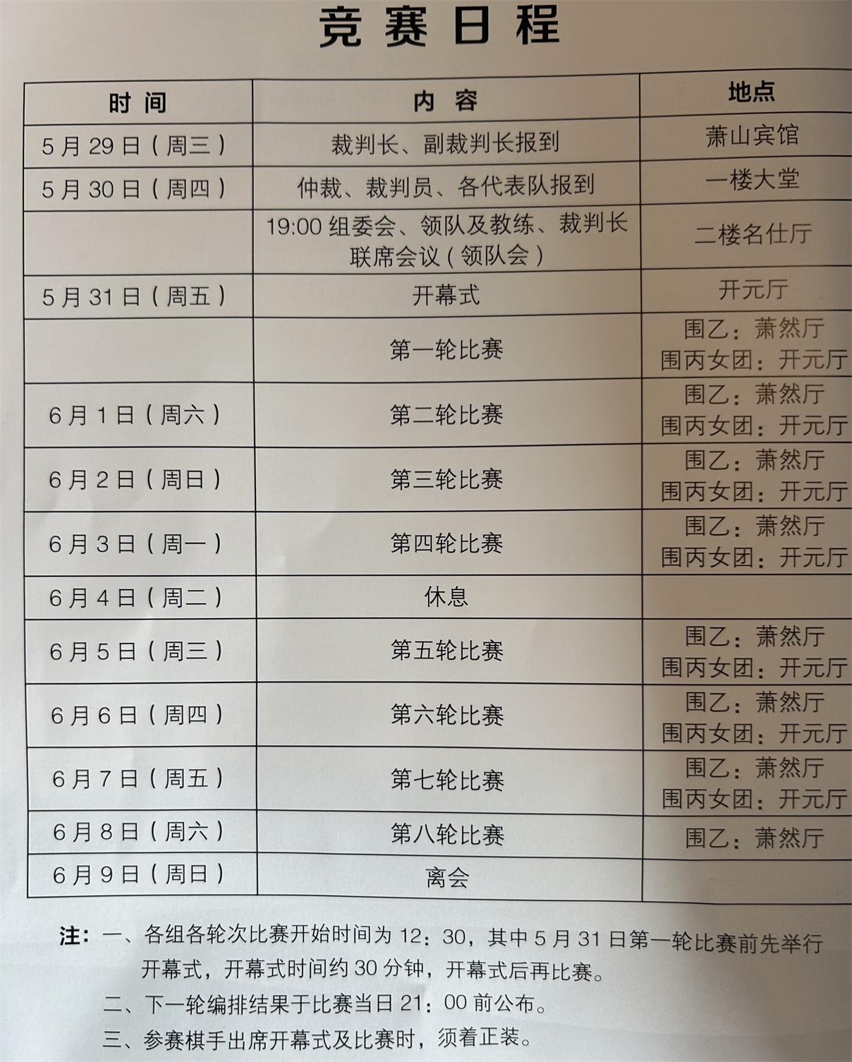 比赛将于2024年5月31日-6月8日在浙江省杭州市萧山区进行,其中围乙8轮,围丙、女团各7轮,共有16支围乙队、33支围丙队和18支女子团体队,共计250位棋手报名参赛,其规模之大、看点之多都大大超过往届比赛。
