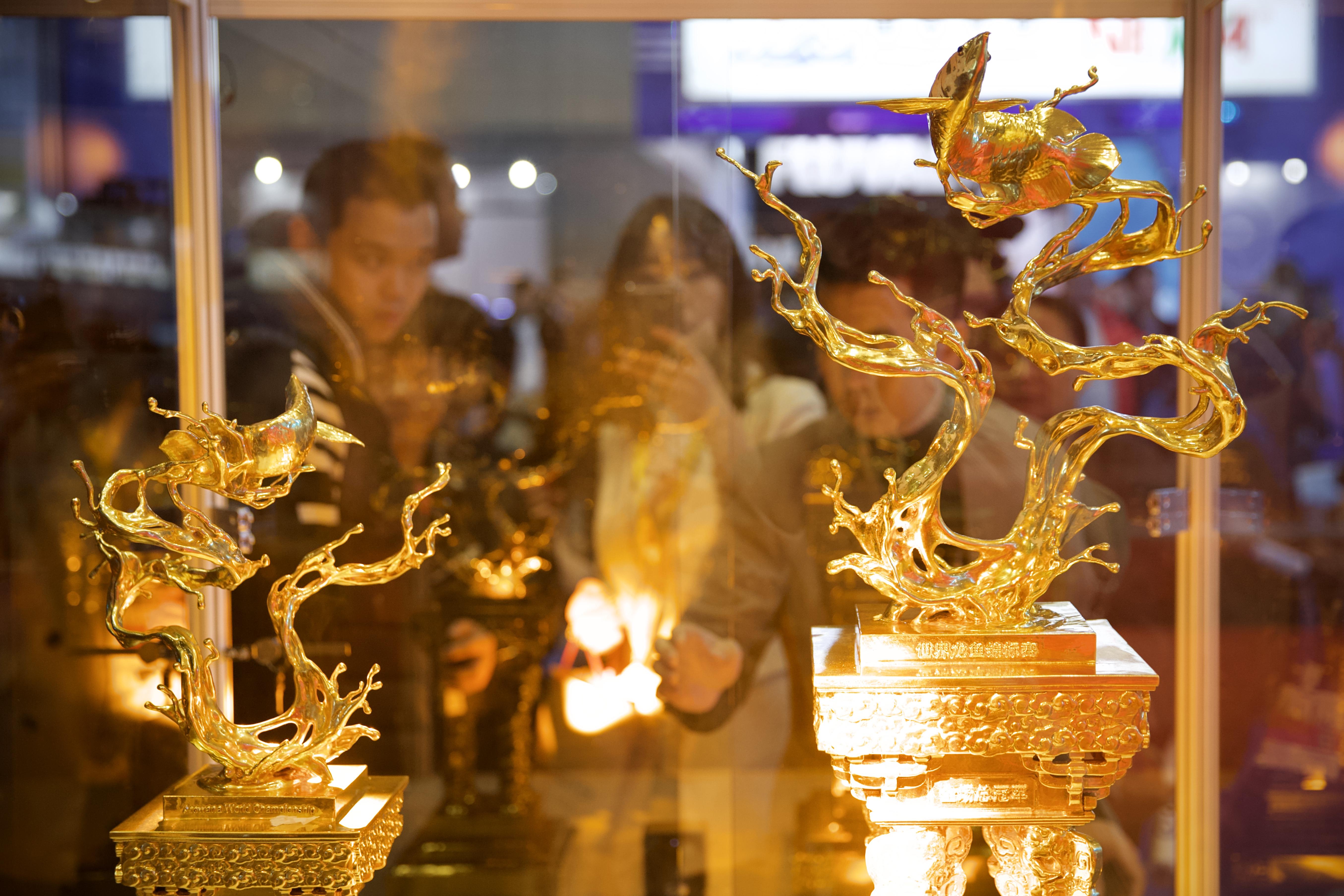 金光灿灿的龙鱼比赛奖杯。新京报记者 郑新洽 摄