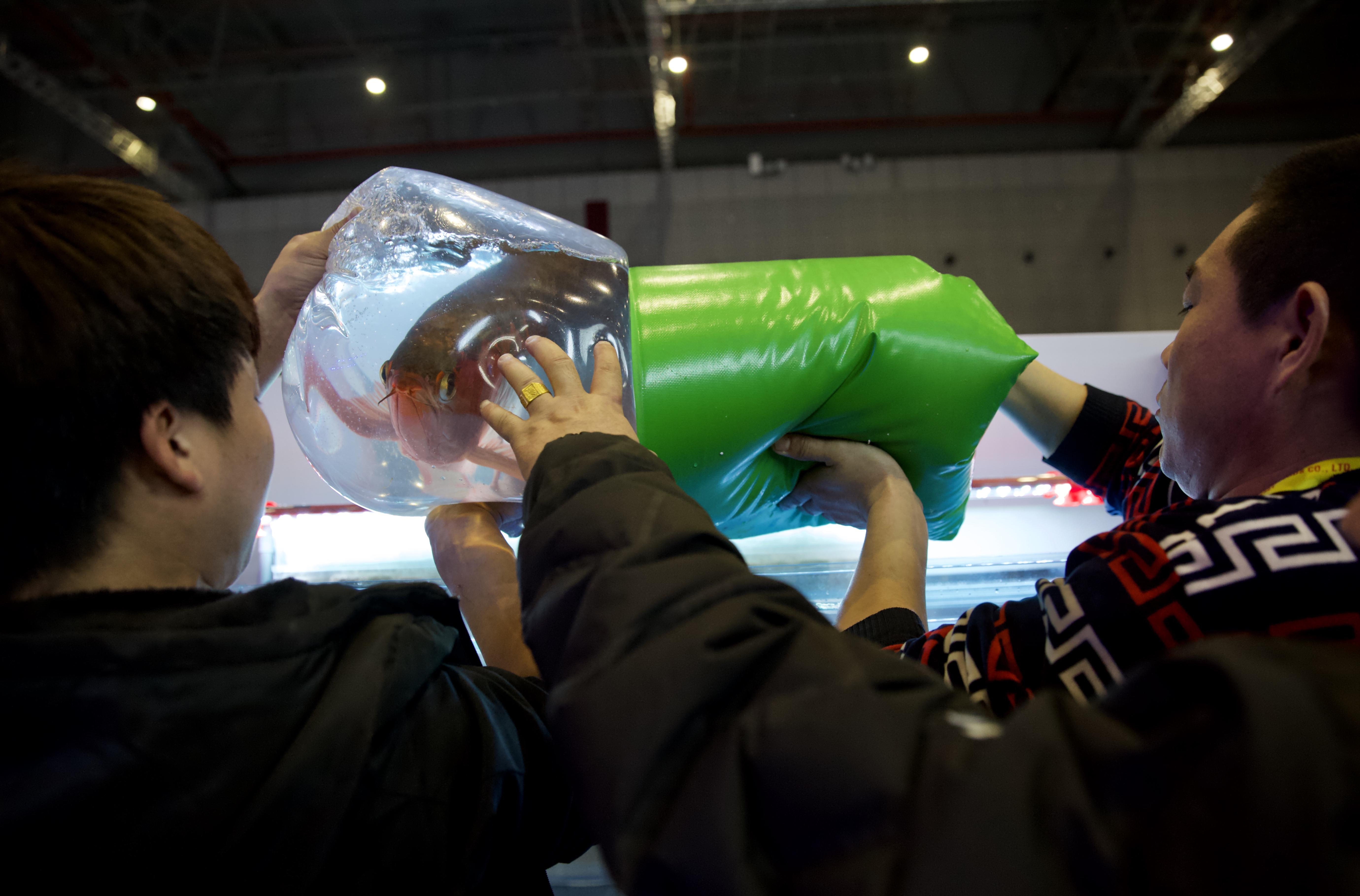 11月19日,比赛会场旁边的商铺,一条红龙鱼刚到就缺氧,放进鱼缸里直翻肚皮,负责人连忙为其供氧抢救。新京报记者 郑新洽 摄