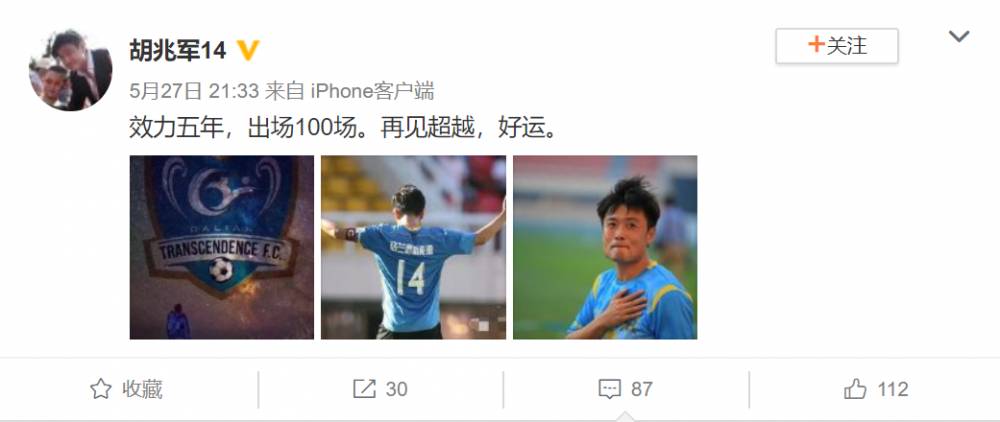 胡兆军在微博这样写道:“效力五年,出场100场。再见超越,好运。”