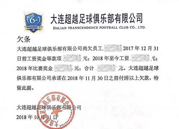 上赛季深陷资金困扰的大连超越,从中甲不幸降入中乙。目前一份超越俱乐部欠薪欠条在网络上传播,欠条中明确标注了2017和2018两实际所拖欠的薪水和奖金,并承诺今年11月30日之前结清所有欠款。