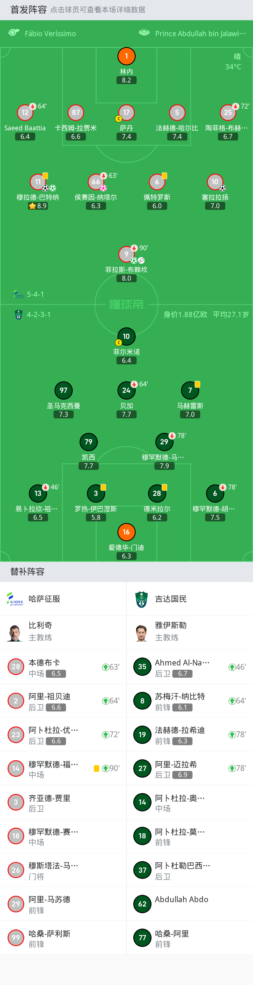 吉达国民 首发:菲尔米诺, 易卜拉欣-祖贝迪, 马赫雷斯, 爱德华-门迪, 圣马克西曼, 凯西, 德米拉尔, 罗热-伊巴涅斯, 穆罕默德-马吉哈德, 贝加, 穆罕默德-胡拉伊