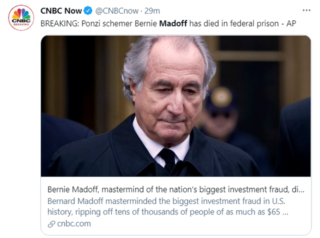 北京时间4月14日晚间,据海外网援引美联社报道,消息人士透露,伯纳德·麦道夫在狱中死亡,终年82岁。报道称,麦道夫死于北卡罗来纳州巴特纳的联邦医疗中心,据信为自然死亡。