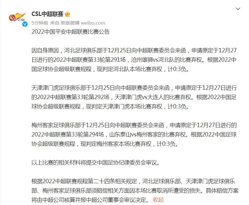 中新网12月26日电 据中超联赛官方微博消息,河北足球俱乐部、天津津门虎足球俱乐部、梅州客家足球俱乐部在12月25日向中超联赛委员会发函,申请在2022中超联赛第33轮比赛中弃权。根据联赛规程,三支球队在对应场次中被判0:3告负。