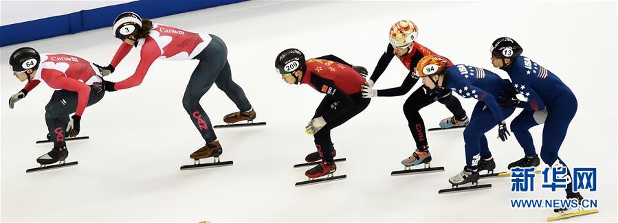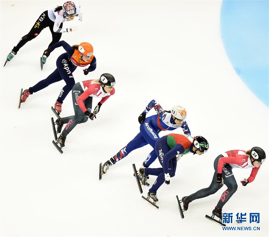 11月12日,加拿大选手布廷(左一)在女子1000米决赛中。最终,布廷以1分28秒885的成绩夺冠。当日,2017-2018国际滑联短道速滑世界杯上海站比赛落幕。 新华社记者李钢摄