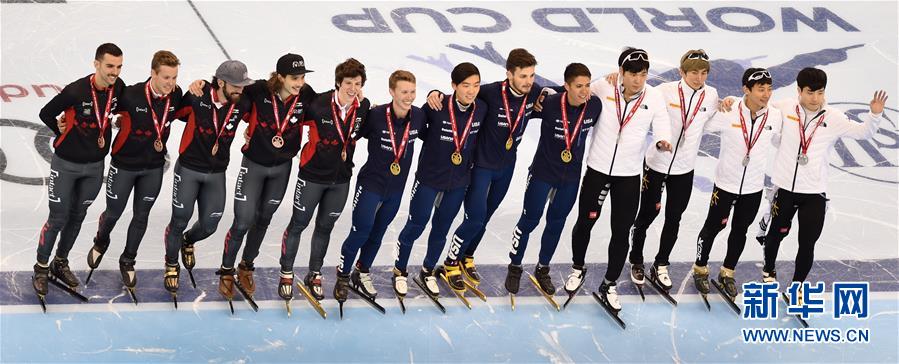11月12日,冠军美国队(中)、亚军韩国队(右)和季军加拿大队在男子5000米接力颁奖仪式上合影。美国队以6分29秒052的成绩夺得冠军,并打破世界纪录。当日,2017-2018国际滑联短道速滑世界杯上海站比赛落幕。 新华社记者李钢摄