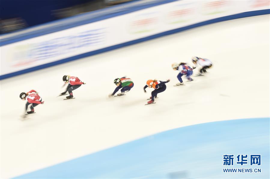 11月12日,加拿大选手布廷(右一)在女子1000米决赛中。最终,布廷以1分28秒885的成绩夺冠。当日,2017-2018国际滑联短道速滑世界杯上海站比赛落幕。 新华社记者李钢摄