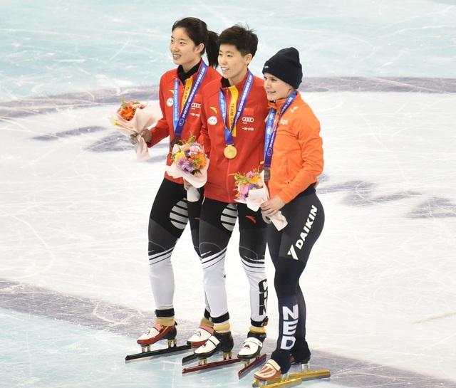 获得女子500米(第二次)的前三名选手,左起:曲春雨、范可新、科尔科霍。中国青年报·中国青年网记者 慈鑫/摄