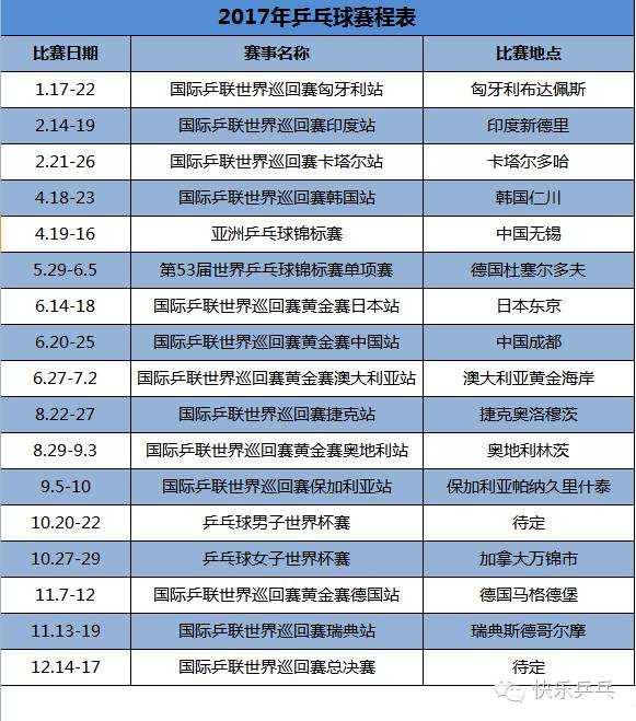 国际乒联日前公布了2017年乒乓球赛事赛程安排,第53届世界乒乓球锦标赛单项赛将于5月29日至6月5日在德国杜塞尔多夫举行;4月下旬开战的亚锦赛落户无锡;中国公开赛将于6月20日至25日在成都进行。此外,国际乒联世界巡回赛总决赛将在12月14日至17日进行,地点待定。