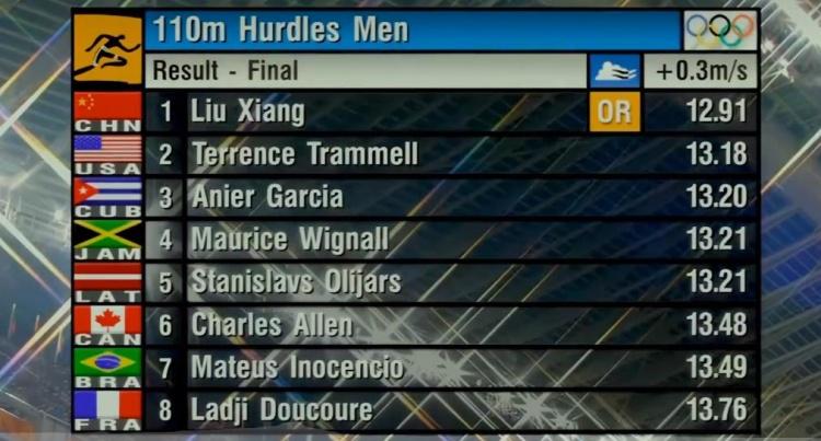 “刘翔,处于领先的位置,刘翔!刘翔赢啦!刘翔赢啦!!刘翔创造了历史!一个黑头发、黄皮肤的中国人成为了世界飞人!!”