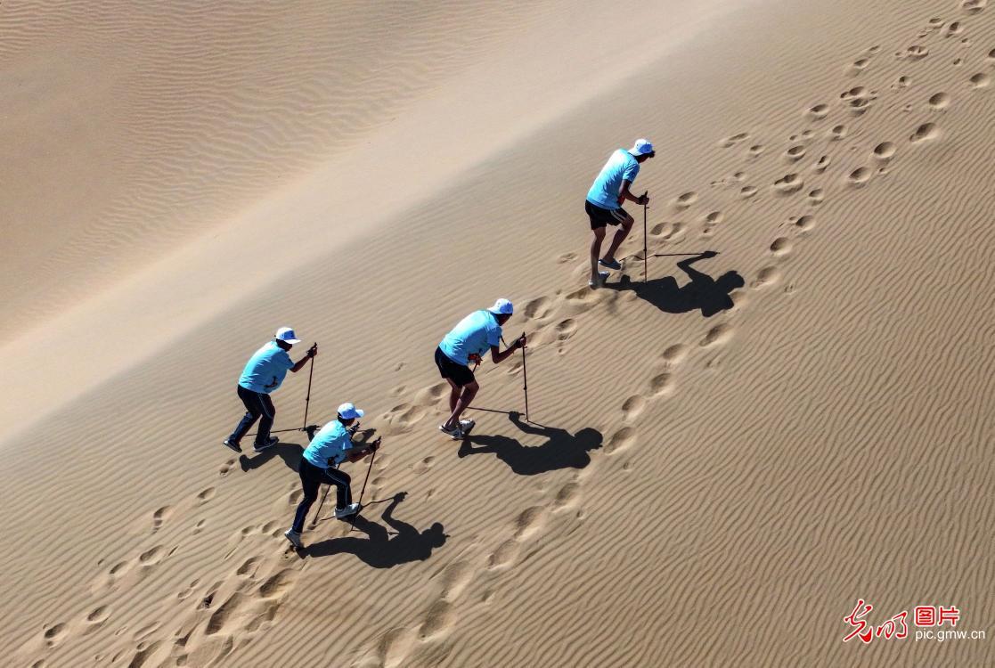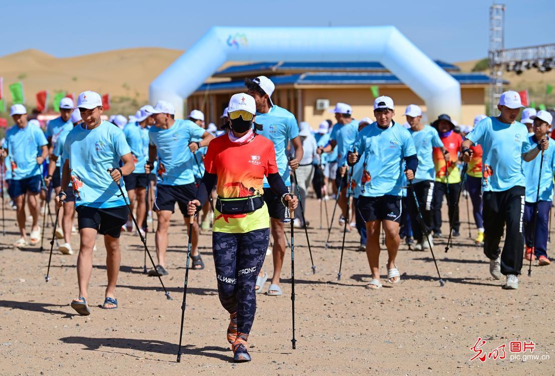 2024年6月25日,内蒙古库布其沙漠越野杖走公开赛在鄂尔多斯市杭锦旗金沙岭沙漠举行,来自北京、天津、山东、内蒙古、宁夏等地的近千名户外运动爱好者穿越10公里赛道,饱览大漠风光,享受沙漠运动之美。比赛由内蒙古自治区体育局、内蒙古自治区体育总会、鄂尔多斯市杭锦旗人民政府主办。(王正摄/光明图片)