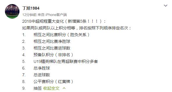 直播吧2月24日讯 北京时间今天,体育记者丁旭在自己的微博中透露了2018赛季中超规则的变化,如果两队或两队以上的积分相同,排名将按照下列顺序排定名次。