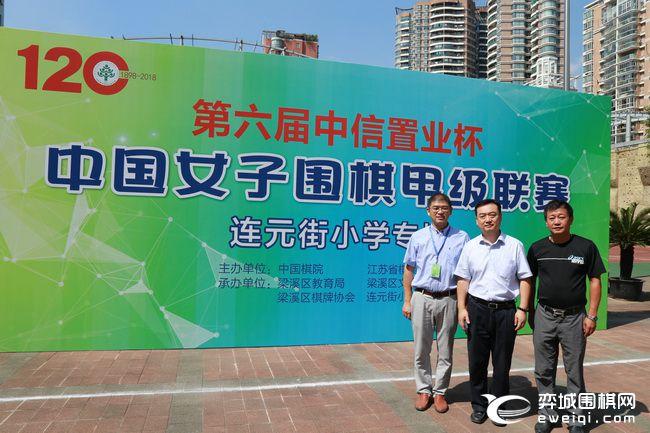 连元街小学围棋负责人庞建忠(左)、天域生态江苏队教练丁波、无锡新天一围棋学校朱建平校长