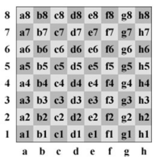以白棋为准,国际象棋棋盘的8条竖线从左到右分别用a、b、c、d、e、f、g、h八个小写英文字母代表;棋盘的8条横线由近及远分别用数字1、2、3、4、5、6、7、8代表。