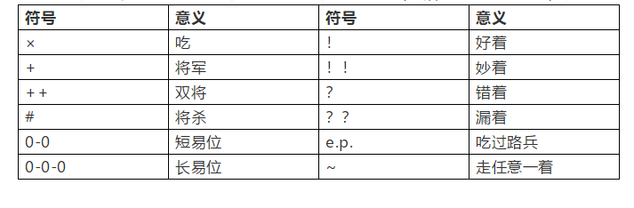 短易位用0-0代表,长易位用0-0-0代表。如果有吃子,用x代表。如果有将军(包括双将),用+代表。如果是升变,升变的棋子加在方格符号后。如果是将死了对方的王,用#代表。