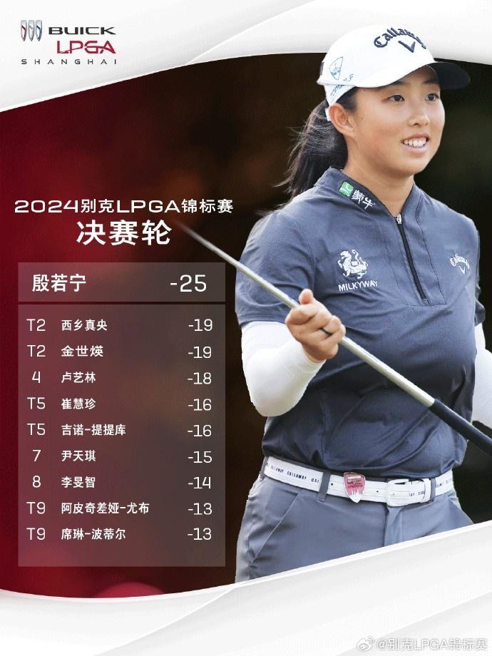 直播吧10月13日讯 2024别克LPGA女子高尔夫锦标赛决赛轮,22岁中国选手殷若宁以-25杆、领先第二名6杆的出色成绩,夺得冠军。