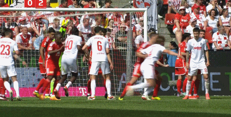 在德国足球顶级联赛第33轮的比赛中,科隆主场迎战柏林联合。上半场,特里梅尔助攻罗宾-克诺赫破门将比分改写,多克希造点弗兰德主罚命中将比分扩大。拉尼-赫迪拉送点,凯因茨主罚命中扳回一分。下半场,戈森斯头球后蹭击中横梁,蒂格斯头球破门将比分扳平。补时阶段达米恩-唐斯头球破门将比分反超。最终科隆主场3-2逆转柏林联合。