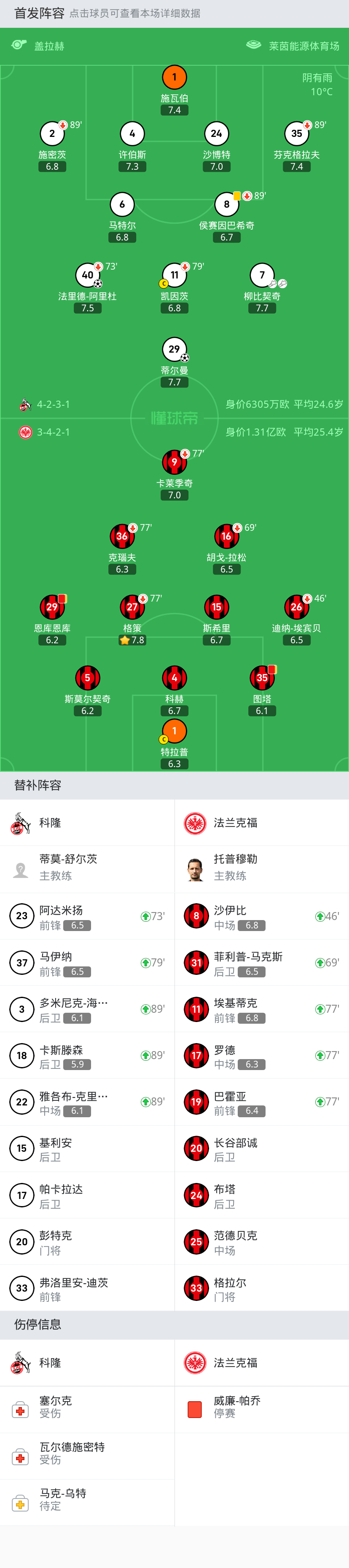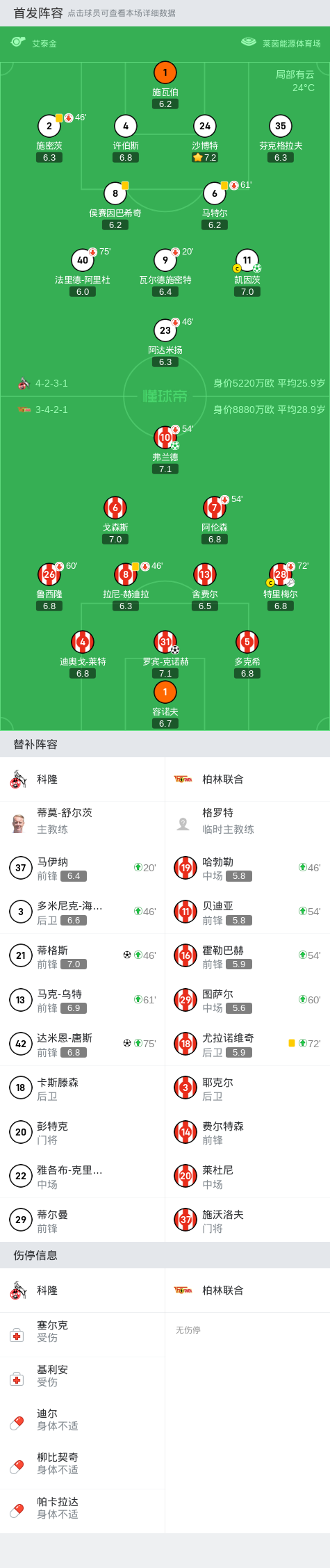 科隆 首发:11-凯因茨, 1-施瓦伯, 27-塞尔克, 23-阿达米扬, 4-许伯斯, 7-柳比契奇, 24-沙博特, 37-马伊纳, 6-马特尔, 29-蒂尔曼, 35-芬克格拉夫
