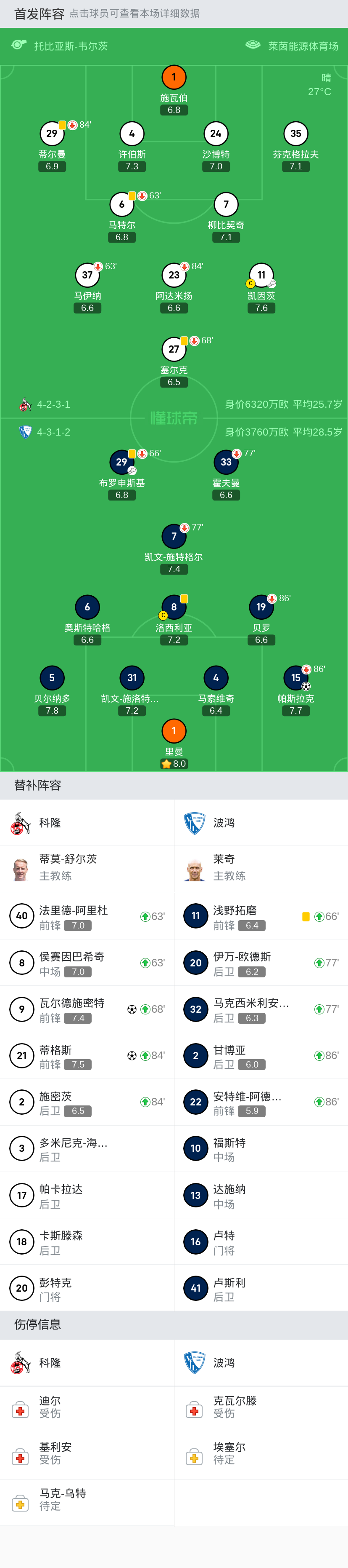 科隆(4-2-3-1): 1-霍恩,2-施米茨,4-许伯斯(65' 15-基利安),5-契乔斯,14-黑克托尔,7-柳比西奇,6-奥兹坎,11-凯因茨,18-杜达(65' 29-蒂勒曼),31-尤他(77' 9-安德松),27-莫德斯特