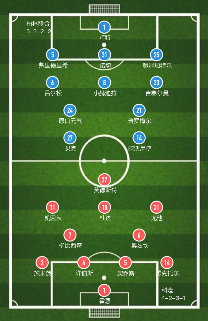 柏林联合(3-3-2-2): 1-卢特,5-弗里德里希,31-诺切,25-鲍姆加特尔,6-吕尔松,8-小赫迪拉,23-吉塞尔曼,24-原口元气(84' 7-奥兹图纳里),21-普罗梅尔,27-贝克(72' 9-沃格萨默),14-阿沃尼伊(84' 17-贝伦斯)