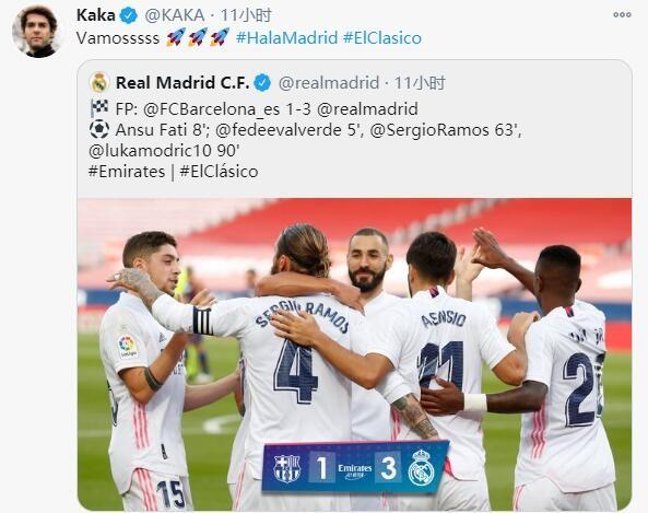 赛后,前皇马球星卡卡在社交媒体上转发了皇马取胜的消息,并配文:“加油!”