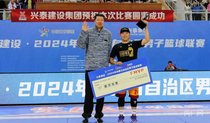 前中国男篮国家队球员、内蒙古篮协主席孟克·巴特尔为冠军球队颁奖(央广网见习记者 杨亚东 摄)