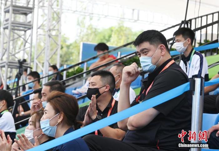 9月19日,在陕西西安举行的第十四届全运会三人制篮球女子19岁以下组赛中,河南队11:10战胜四川队。图为中国篮协主席姚明现场观赛。 中新社记者 安源 摄
