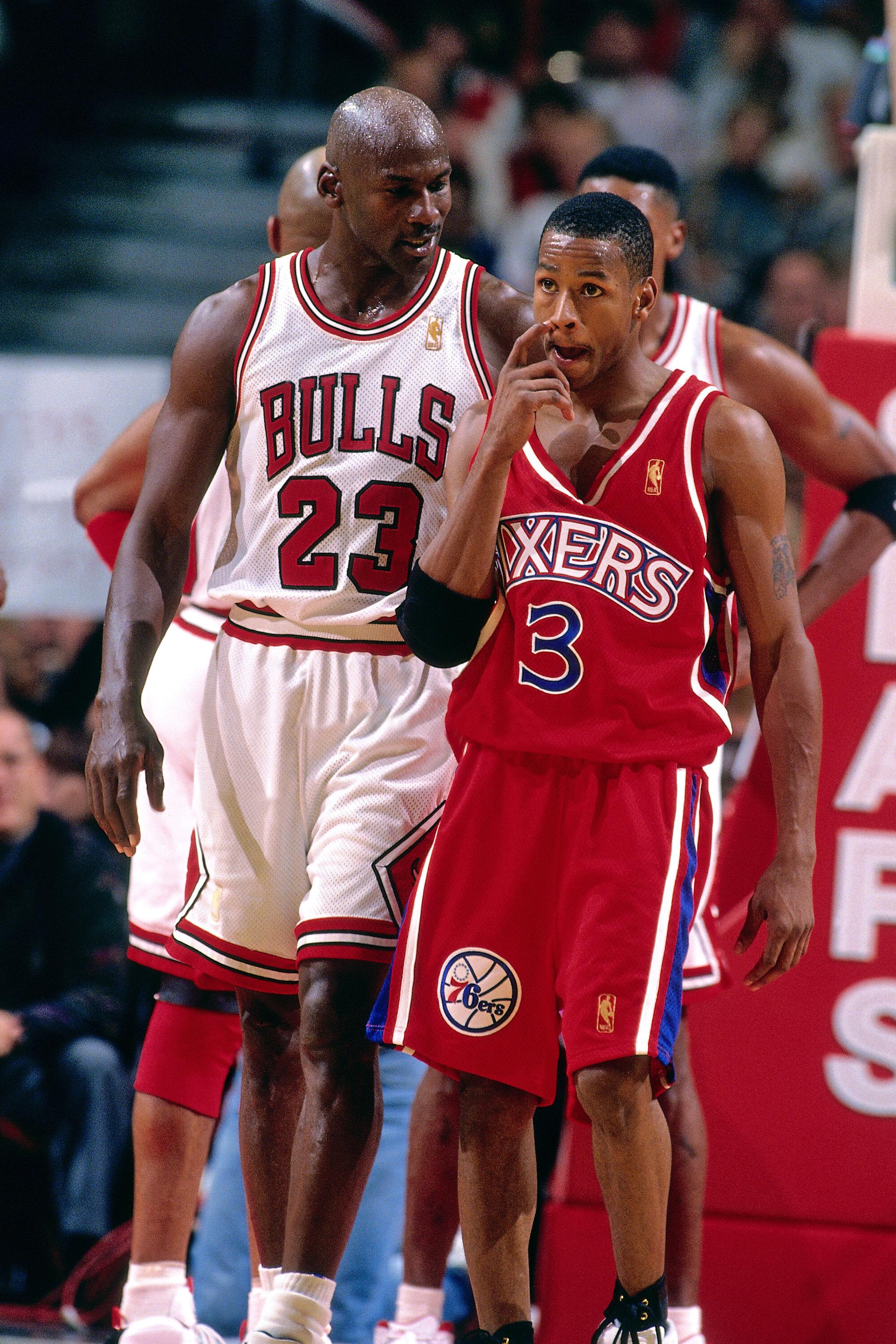 当你说一个新秀把被称为“篮球之神”的迈克尔·乔丹晃翻在地,很多人都会说你疯了。在艾弗森的新秀赛季,在和芝加哥公牛的比赛中艾弗森终于有了单挑乔丹的机会。当队友为艾弗森拉开的时候,所有球迷全体鼓掌起立,为艾弗森的勇气呐喊。只见答案连续的crossover,趁着乔丹重心不稳一记干拔跳投稳稳命中!这也成为了他职业生涯中最经典的一个镜头!