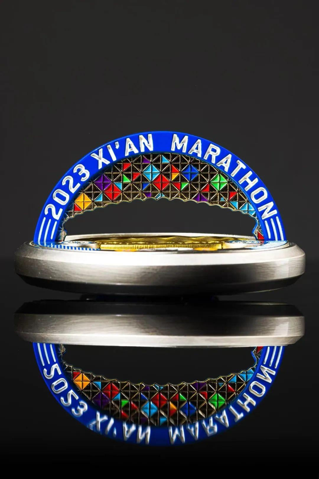 据介绍,2023年西安马拉松的奖牌由奖牌设计大师付琨打造,灵感源于“门与钥匙”,诠释西安马拉松与门之间的不解之缘。奖牌上,弯如长虹的抽象拱门横亘于上,镀金工艺的奥体中心光泽夺目,雄踞中央的永宁门城楼惟妙惟肖。