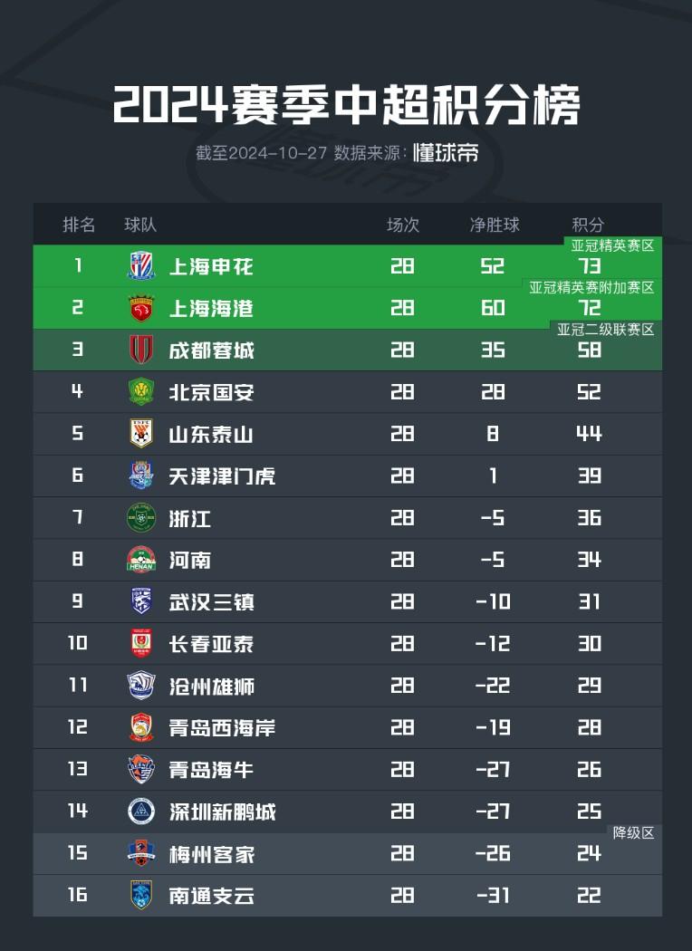 目前,上海申花积73分位列中超积分榜第一,上海海港积72分落后申花1分位列第二,两队的冠军争夺进入了白热化阶段;成都蓉城和北京国安将对一个亚冠资格展开争夺,成都蓉城积58分暂领先国安6分,但国安和成都两回合相互战绩占优,国安理论上仍有可能在积分榜反超成都的机会;降级区内,梅州积24分、南通积22分双双位列降级区,而深圳、青岛也分别仅高出降级区1分和2分,目前这几支球队的保级形势都并不明朗。