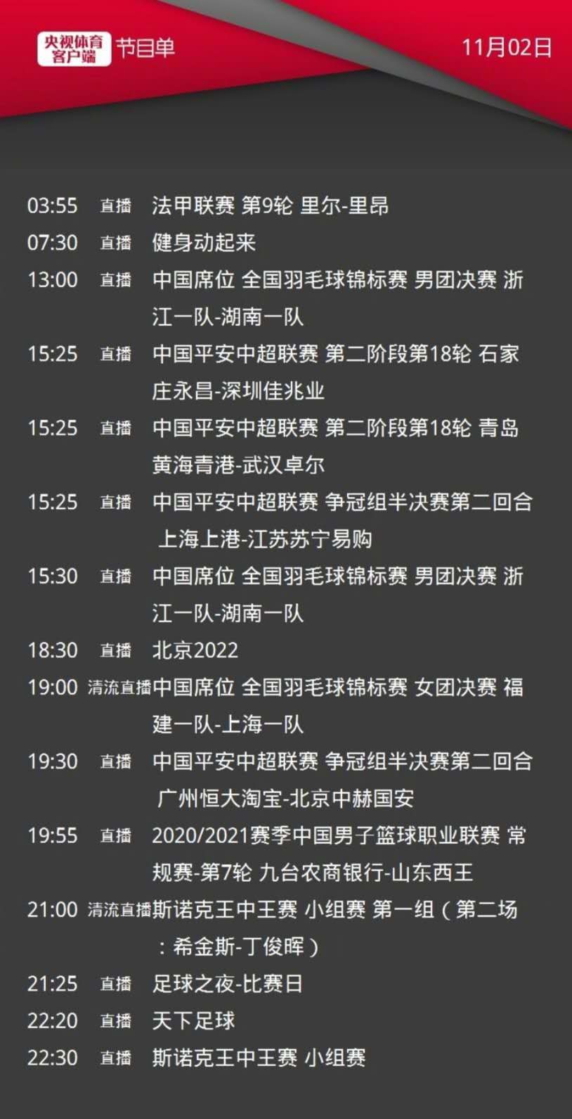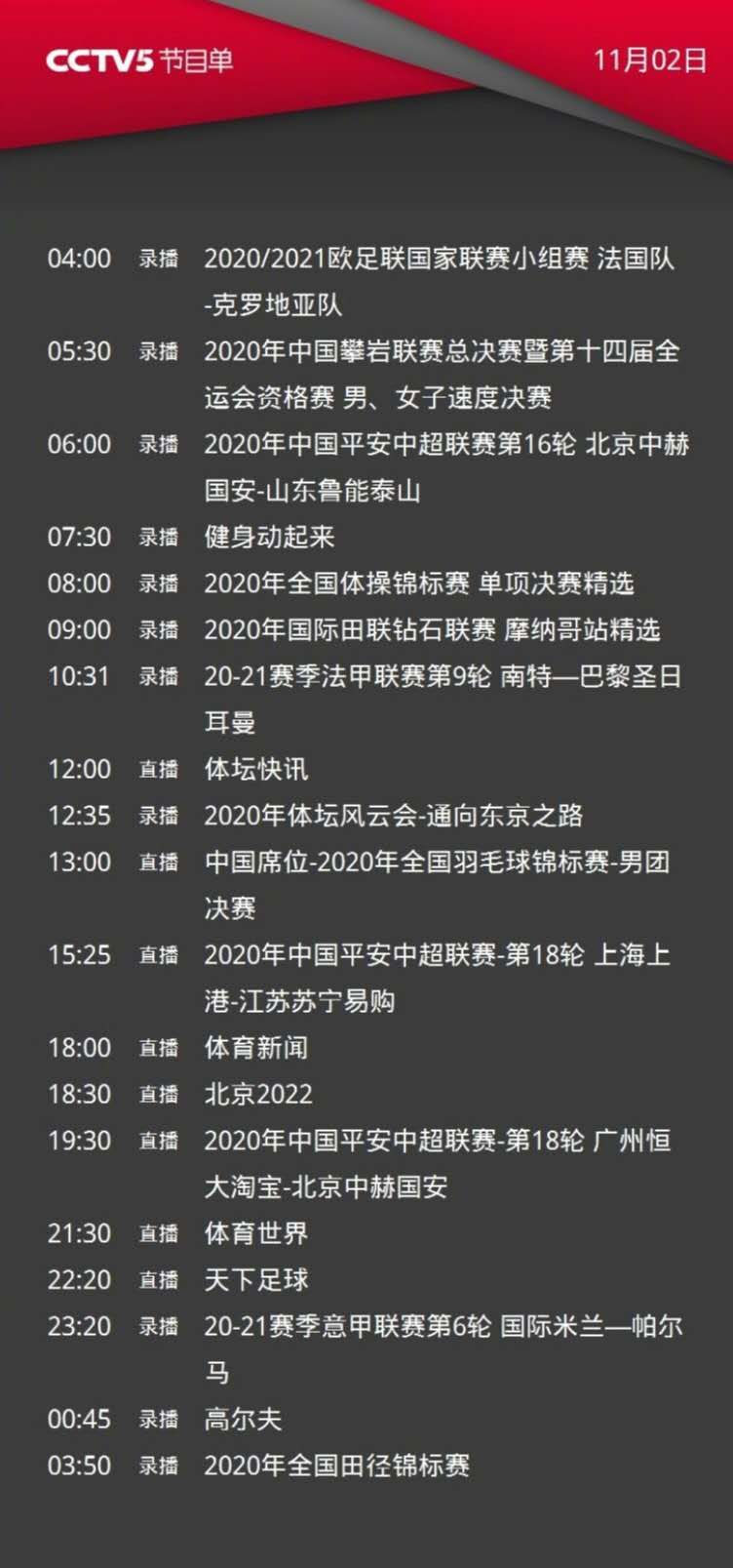 CCTV513:00直播2020年全国羽毛球锦标赛-男团决赛。15:25直播中超联赛-第18轮(上港-苏宁)。19:30直播(恒大-国安)。23:20国际足球赛场-20-21赛季意甲联赛第6轮 国际米兰—帕尔马。